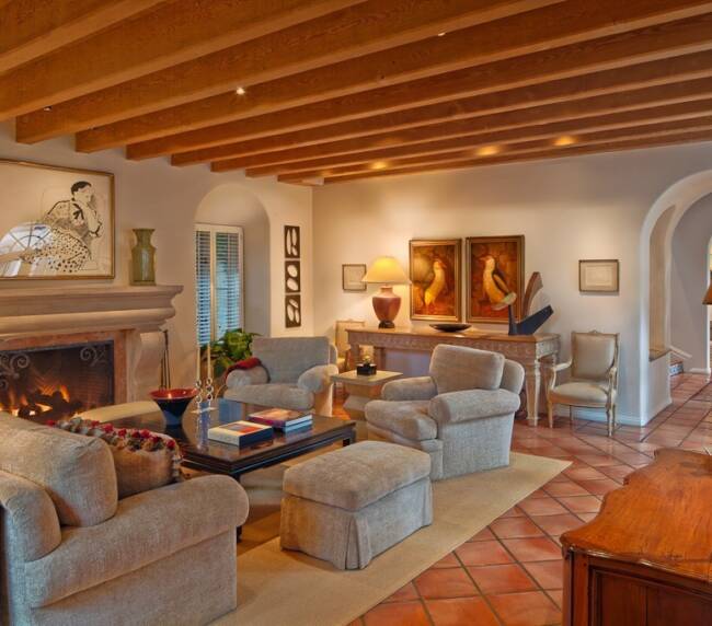 This Mediterranean style home has Saltillo tile and exposed beams with a T&G ceiling on the entire first floor. The kitchen was a more recent remodel with Caesar stone counter…